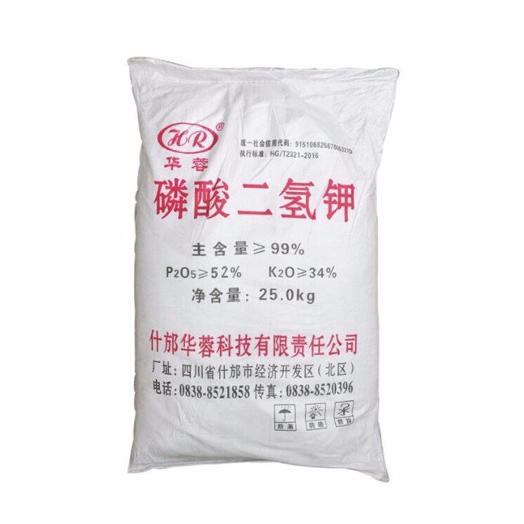 2.農(nóng)業(yè)上用作高效磷鉀復(fù)合肥;磷酸二氫鉀產(chǎn)品廣泛適用于各類型經(jīng)濟(jì)作物、糧食、瓜果、蔬菜等幾乎全部類型的作物,各省均由當(dāng)?shù)氐霓r(nóng)科院所、土肥站等專家機(jī)構(gòu)針對(duì)磷酸二氫鉀適用于各類典型作物進(jìn)行了很多的相關(guān)應(yīng)用實(shí)驗(yàn),通過各地對(duì)各類型作物的實(shí)際施用效果證明磷酸二氫鉀具有顯著增產(chǎn)增收、改量?jī)?yōu)化品質(zhì)、抗倒伏、抗病蟲害、防治早衰等許多優(yōu)良作用,并且具有克服作物生長(zhǎng)后期根系老化吸收能力下降而導(dǎo)致的營(yíng)養(yǎng)不足的作用。磷酸二氫鉀屬新型高濃度磷鉀二元素復(fù)合肥料,其中含五氧化二磷52%左右,含氧化二鉀34%左右??緹熜枇?、鉀量大,特別是需鉀量大。磷酸二氫鉀是用于烤煙的一種較為理想的新型肥料。為了探索磷酸二氫鉀在烤煙上的使用價(jià)值和施用方法,以提高煙葉品質(zhì)。磷酸二氫鉀用在棉花上能夠控制棉花徒長(zhǎng),增加植株花苞數(shù)量。磷酸二氫鉀廣泛運(yùn)用于滴管噴灌系統(tǒng)中。